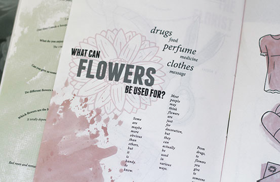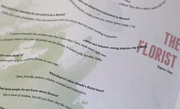 The book consist of different information about flowers, how to take care of them, interviews, and experiments. It is both informative, but also made to be pleasing and interesting to look at.The page size varies from beginning to end. The various page sizes symbolizes how the flower grows from being tiny, to big and beautiful. It also shows the flower’s petals and leaves have different «layers» and sizes.