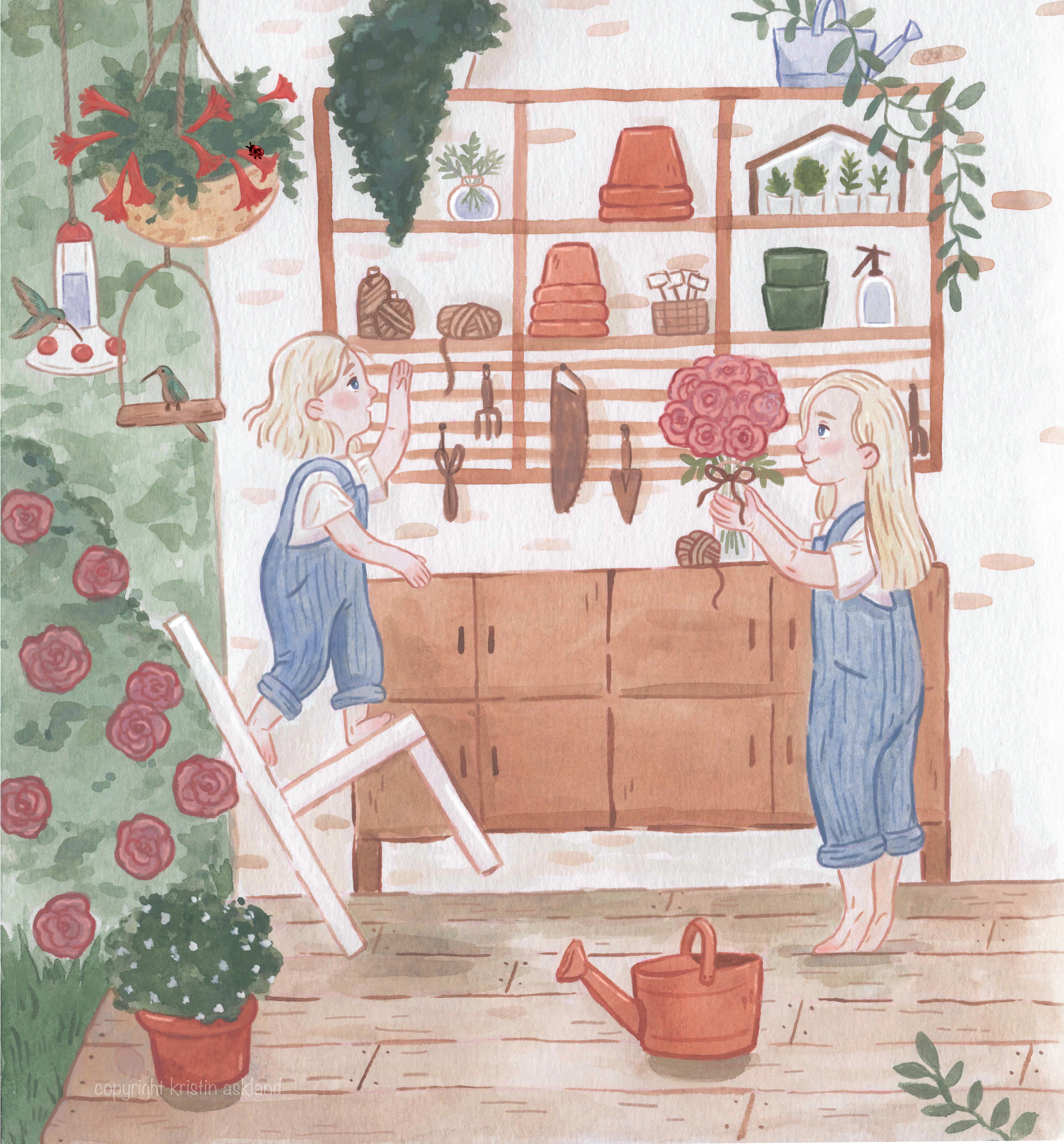 Follow along the sisters Audrey and Poppy as they lead you trough how to care for roses. Growing Roses is the perfect book for any garden lover and encourages readers to explore what's growing and living in their garden! The illustrations are painted with watercolour and gouache, then digitally finished and tweaked after scanning.